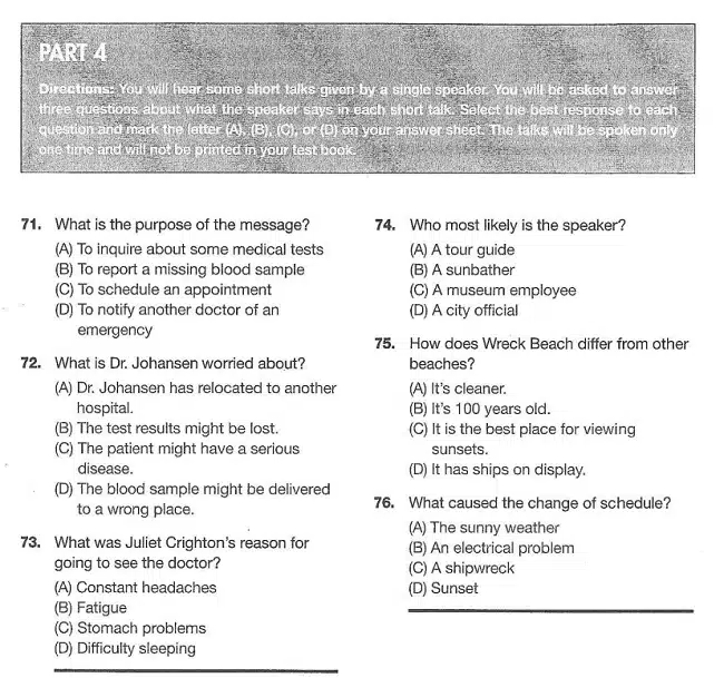 | Part 4: Bài nói chuyện | Nghe bài nói chuyện ngắn và chọn đáp án đúng. Phần này có tốc độ nhanh hơn và độ khó cao hơn. Cần tập trung cao độ nhất để có thể nghe kịp. |