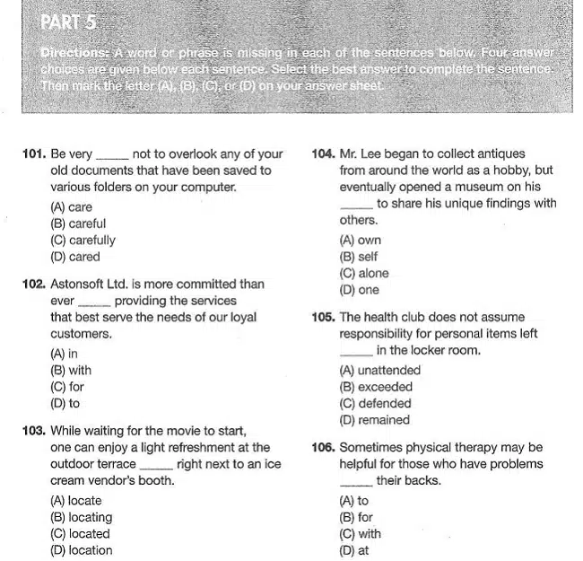 | Part 5: Hoàn thành câu | Bài tập điền từ/cụm từ vào câu, tập trung vào từ vựng và ngữ pháp. |
